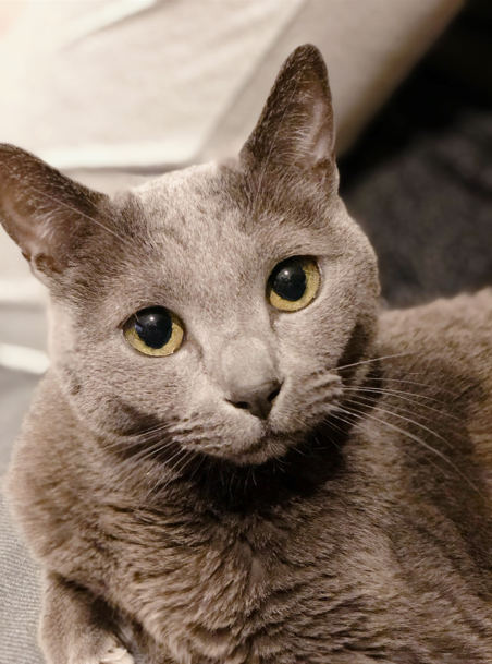 毛並みの綺麗なロシアンブルーのメスで、萌黄色なのに光の加減で金色のように見える瞳が綺麗な子です。警戒心が強く、触ろうとするとバシっと手が出て、多くの猫が大好きであろうチャオチュールにも興味がなく(もっとお高いゼリー状のウェットフードは食べていました)、自分の気分のいい時だけ撫でさせてくれて、撫でないと「なんで撫でないのよ!」と言わんばかりに膝に乗って顔を押し付けてきて、、なんてお嬢猫様なんだろうと母と笑っていました。こんなお嬢様だけど気を許した人にはとても甘えん坊で、母や私が仕事で出かける時には足元にくっついて行かないでよーと爪を立てていました。