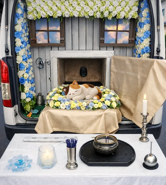 ご自宅やお借りしている駐車場など、十分なスペースが確保できる場合は、その場で個別火葬を行います。スペースの確保が難しい場合やご希望に応じて、一度大切なご家族をお預かりし、指定の火葬場にて個別火葬を執り行います。火葬後は、お骨をご自宅まで丁寧にお返しいたします。